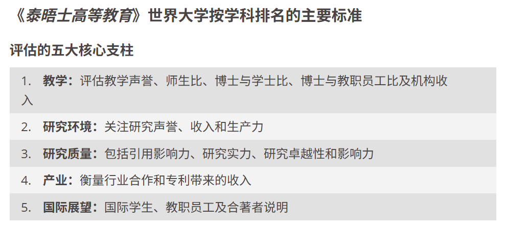 和世界大学排名一样,THE的学科排名采用同样的18项绩效指标,分为五大核心支柱,全面展现学术和科研的卓越表现。