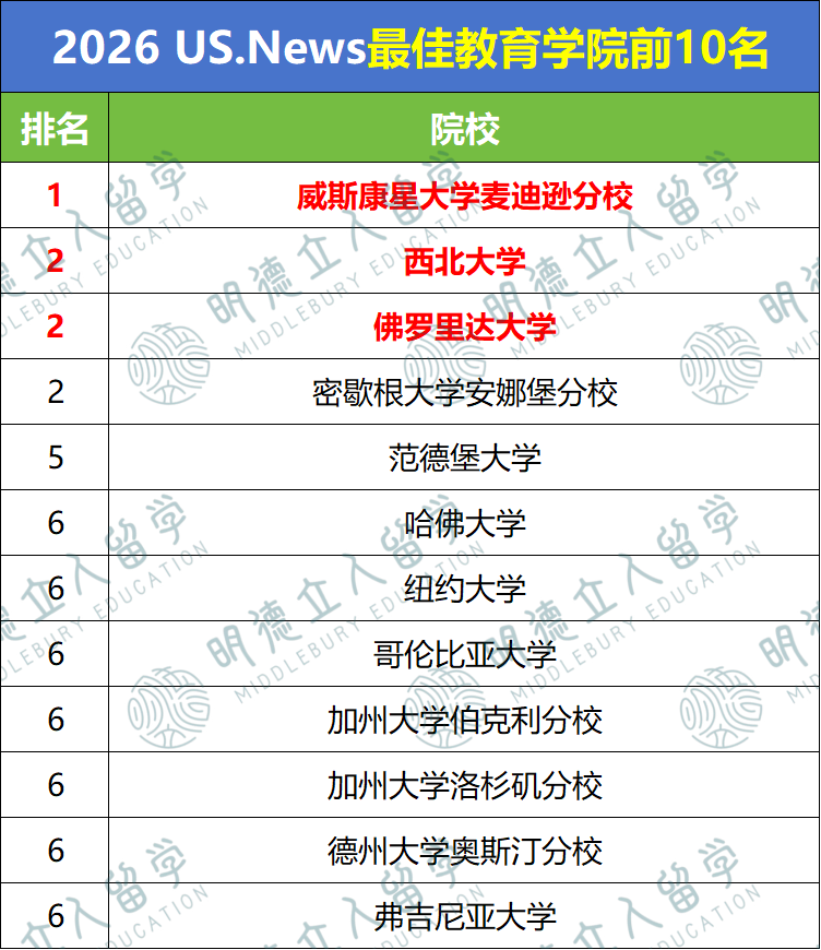 - 共有12校入围!威斯康星大学麦迪逊分校凭借雄厚师范底蕴稳登第一;